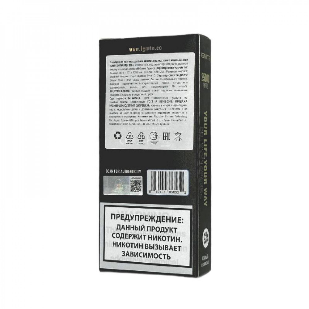 Технические характеристики Электронная сигарета Ignite V250 Gold 25000 - Blueberry Strawberry Coconut (Черника клубника кокос)